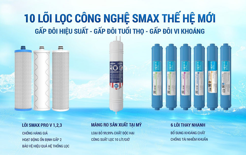 Ứng dụng công nghệ Smax mang đến hiệu suất cao vượt trội, gấp đôi tuổi thọ lõi lọc. Đặc biệt, kết cấu lõi lọc sắp xếp khoa học, thuận tiện cho việc thay lõi cũng như chống nhiễm tái khuẩn, bảo vệ nguồn nước tinh khiết đạt chuẩn đóng chai và bổ sung gấp đôi khoáng chất.
