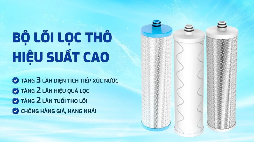 Hệ lõi lọc thô hiệu suất cao được thiết kế với cấu trúc 2 lớp chống hàng giả, giúp bảo vệ tối ưu toàn bộ hệ thống lọc. Nhờ diện tích tiếp xúc lớn gấp 3 lần và khả năng lọc siêu mịn từ 1 micromet, lõi dễ dàng loại bỏ mùi, chất hữu cơ, sạn cát và tạp chất siêu nhỏ. Hiệu suất lọc tăng gấp đôi, tuổi thọ lõi đạt tới 12 tháng – giúp tiết kiệm đến 50% chi phí thay lõi so với các sản phẩm thông thường.