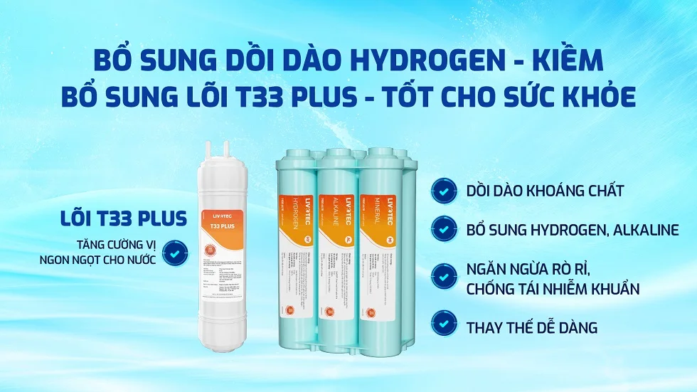 | Số tầng lọc | 11 lõi bao gồm: Bộ lõi lọc thô 1,2,3 hiệu suất cao; Màng lọc RO đúc Hàn Quốc; Cụm lõi khoáng đúc hiệu suất cao ( Khoáng đá, Alkaline, Tourmaline, Hydrogen, T33-GAC, Nano Silver Plus, T33 Plus ); Tăng cường thêm lõi T33 Plus |