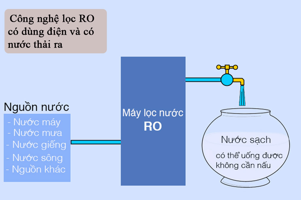 – Chính vì do kích thước khe lọc cực kỳ nhỏ nên máy sử dụng công nghệ lọc RO thì có sử dụng điện và có nước thải ra ngoài.
